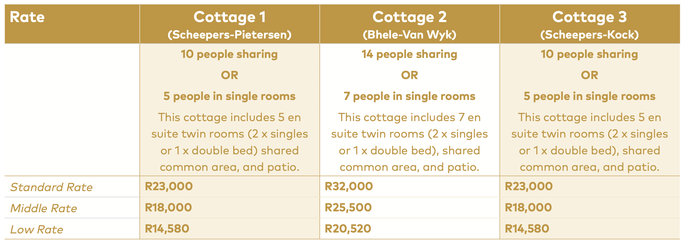 Bhele-Van Wyk Cottage : This is the biggest of all the cottages with seven bedrooms accommodating a maximum of 14 people.