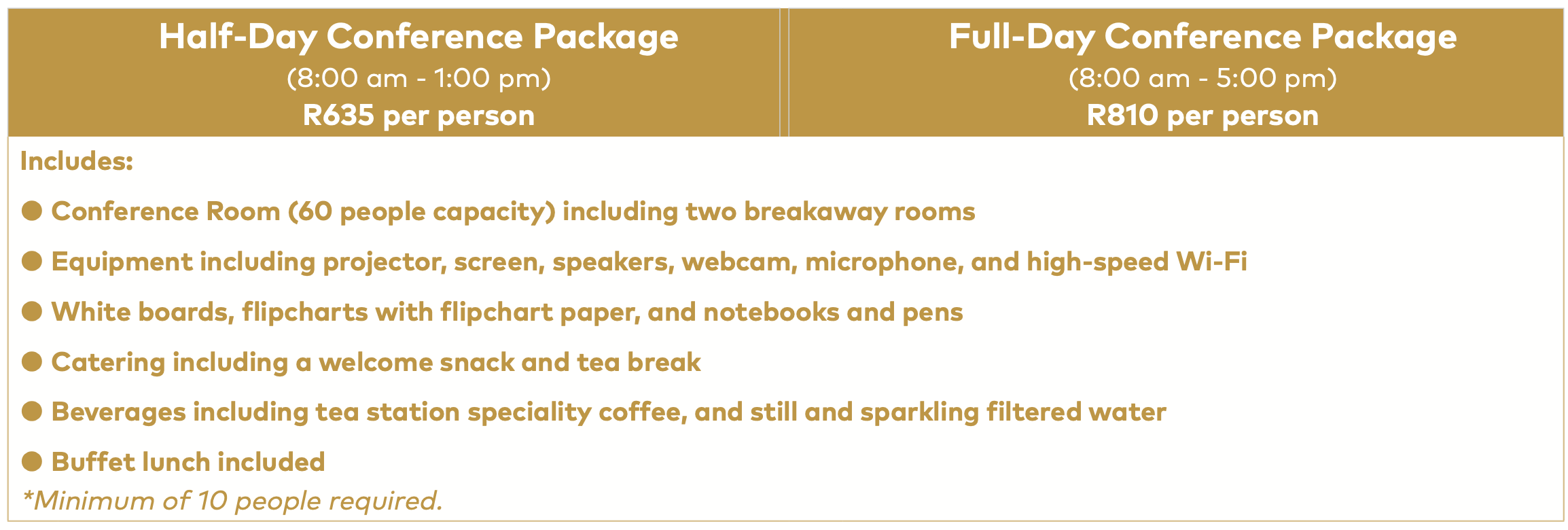 Full day and half-day bookings are priced at one rate for all groups. Minimum of 10 people required. Prices include VAT. Our community partners in the Dwarsrivier Valley will be exempt from venue hire but will be charged for meals.